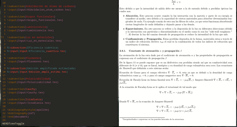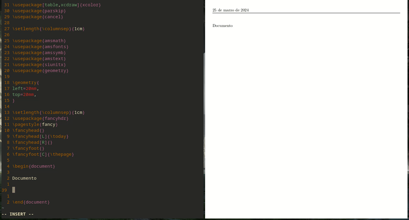 Utilizo VimTeX como el plugin principal, ya que resalta la sintaxis del documento LaTeX y facilita su compilación directamente desde Vim. Además, utilizo el visualizador Zathura para ver el documento en tiempo real mientras edito.